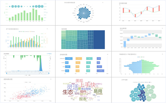 - 數(shù)十種的可視化圖表效果,包括柱形圖、折線圖、雷達(dá)圖、散點(diǎn)圖和詞云圖等,滿(mǎn)足不同人群的閱讀偏好,為您展示多樣數(shù)據(jù)信息提供全面支持